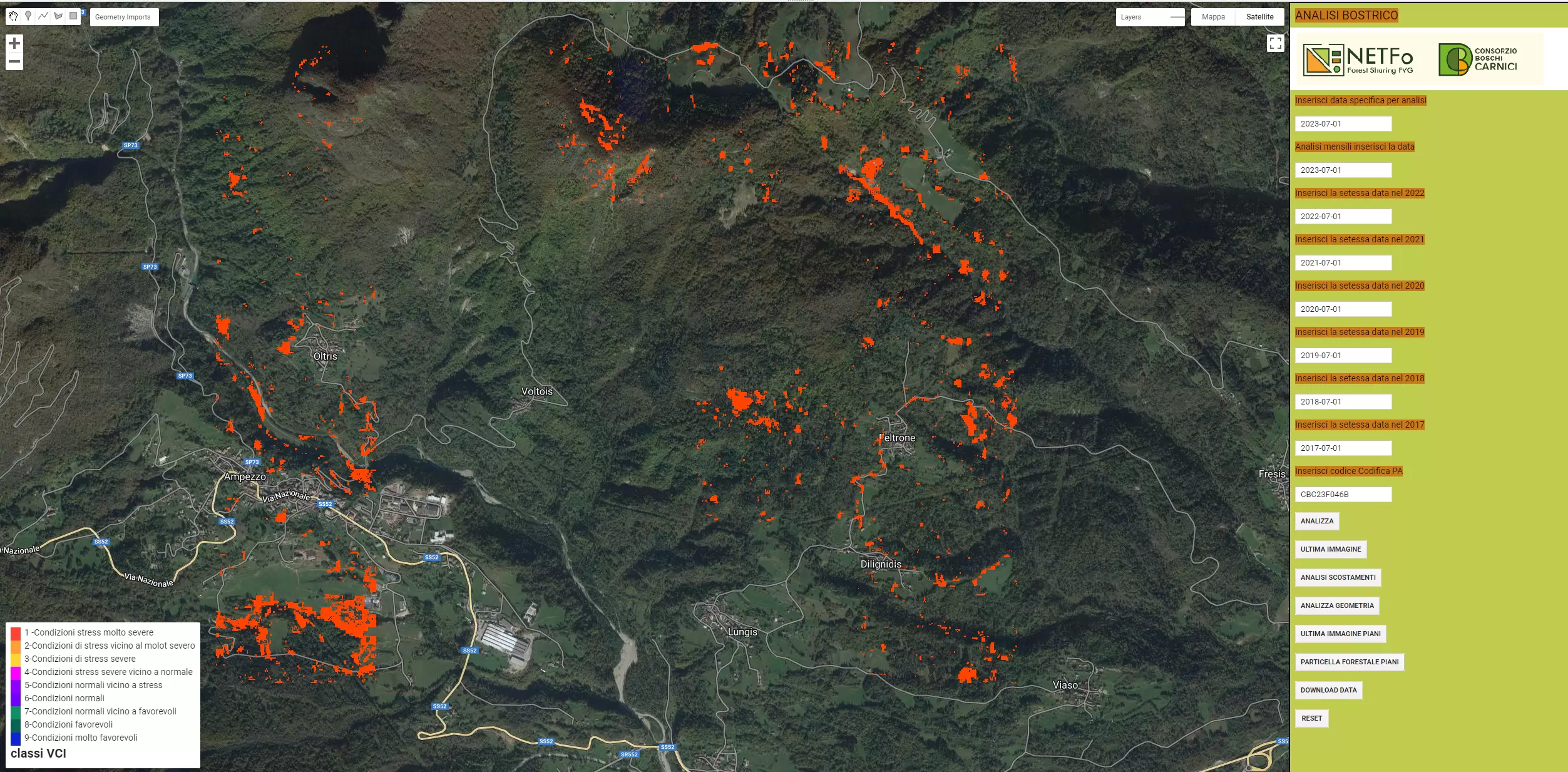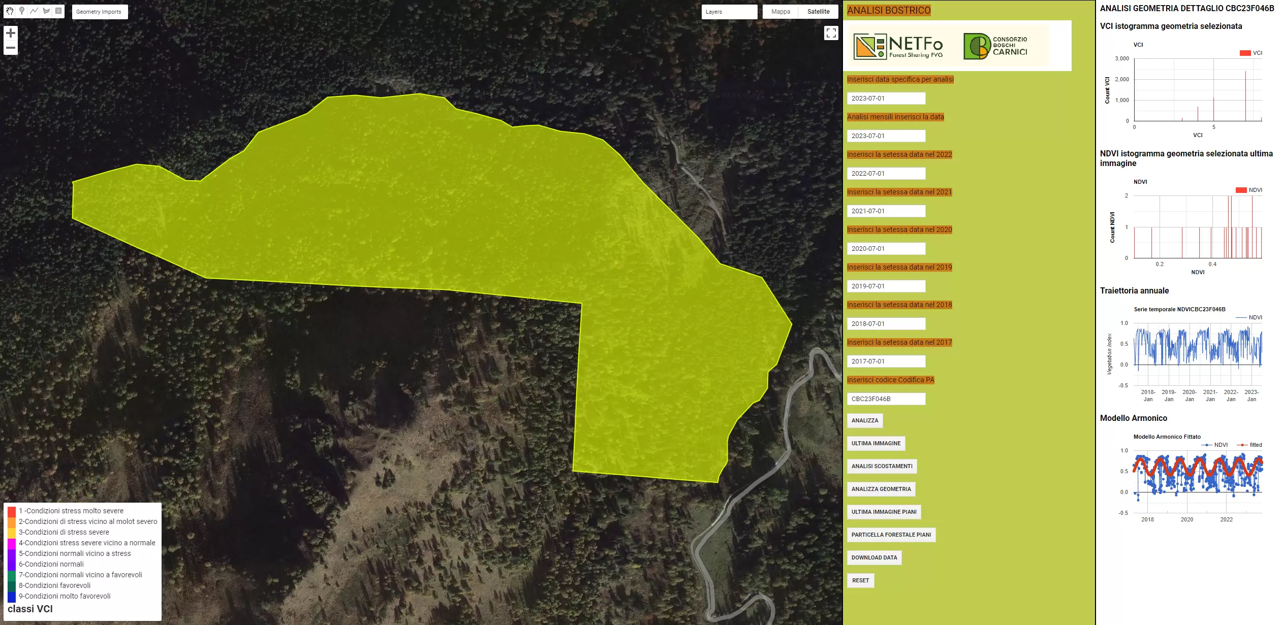 Immagine 3 - Esempio di analisi di dettaglio della distribuzione dell’indice VCI, NDVI e della traiettoria spettrale su una specifica particella forestale che può essere richiamata immettendo il codice di riferimento della particella.
