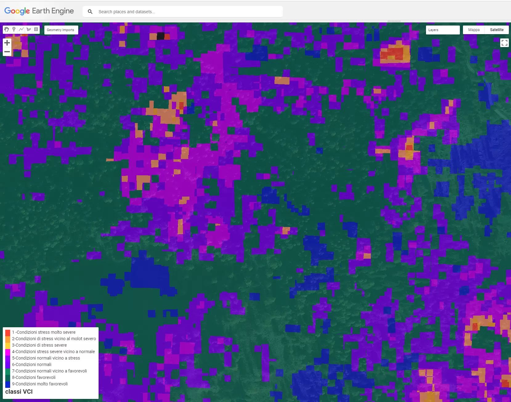 Immagine 2 - Indice VCI basato su comparazione dell’indice NDVI sulla base delle baseline degli anni precedenti identificando le varie soglie di differenza. Le condizioni di stress indicate come severe sono quelle in rosso e arancione, mentre in viola chiaro e scuro sono indicate le condizioni normali ma già vicine a una condizione di stress.