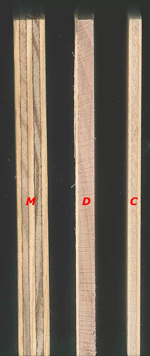 I fogli possono essere di spessori e di specie diversi, sfruttando differenti densità e ritiri. In alternativa possono essere realizzati applicando su sottili fogli di legno, altri materiali insensibili all’umidità (ad es. strati sottili di materiali plastici, di metalli, ecc.) in modo da produrre un pannello composito.