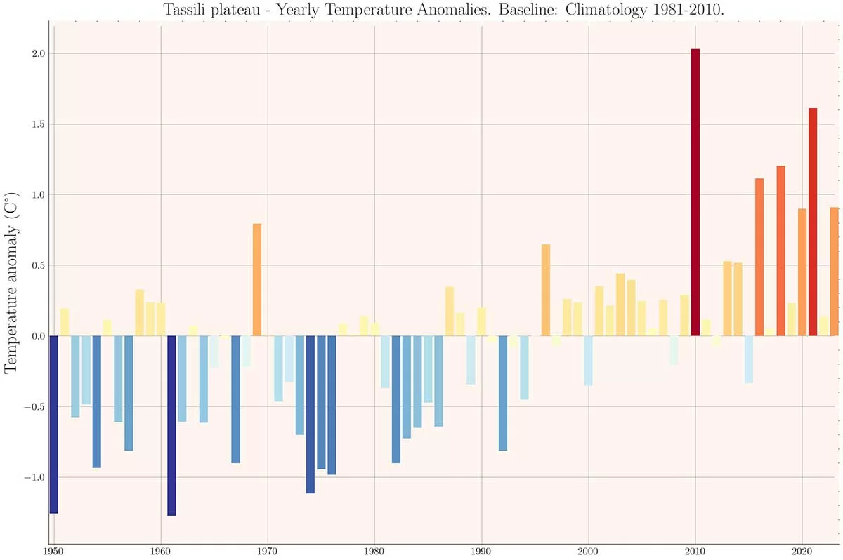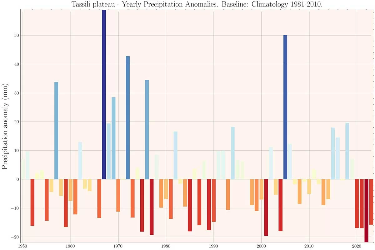 Per la zona di oued Tamghit si è dedotto che la temperatura media annuale (baseline 2000-2020) è di 19,4 °C; la T media delle massime è di 33,1 °C, mentre la temperatura media delle minime è 1,7 °C. Dal 1950 al 2023 gli estremi termici più rilevanti si sono registrati nel febbraio dell’anno 1952 (-8°C) e nell’agosto del 2023 (37,8°C). Mediamente le precipitazioni annue cumulate sul plateau ammontano solamente a circa 25 mm. Da quando è disponibile la serie temporale ERA5 Land (gennaio 1950), l’anno più piovoso, con 81 mm, è stato il 1967. Dall’analisi della serie storica si desume che altri 5 anni hanno avuto precipitazioni superiori a 50 mm annui (2005, 1976, 1972, 1969, 1957) mentre ben 18 anni hanno fatto registrare precipitazioni inferiori ai 10 mm.